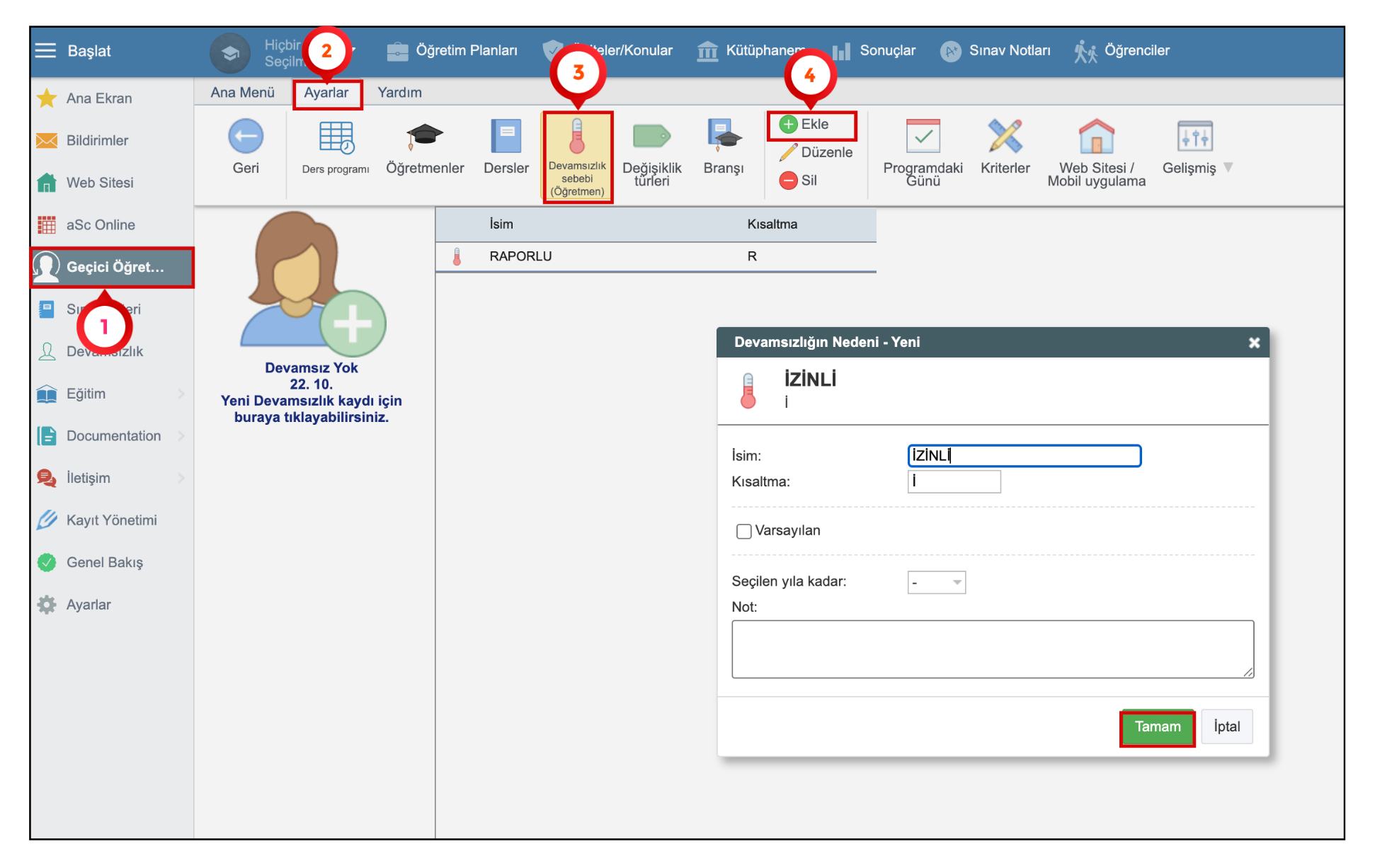 4️⃣ Sonrasında ise “Ekle” seçeneği ile eklemek istediğiniz devamsızlık türünü seçerek “Tamam” seçeneği ile kaydetmelisiniz.